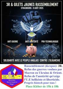 Rassemblement (& expo) 3R « Macron nous vole et a tué la paix, qui s’en soucie ? 2027 ne résoudra rien, agissons ! »