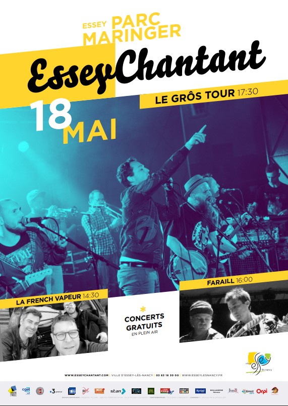 Pour la 26ème édition du festival Essey Chantant, le parc Maringer accueille 3 groupes bien différents. Dès 14h30, La French Vapeur, groupe Mosellan, présentera son univers folk-rock suivi de Faraill à 16h, groupe inclassable au même titre qu’Higelin, Thiéfaine, Philippe Katerine ou M. Le festival se terminera à 17h30 en feu d’artifice avec Le Grôs Tour, un collectif de 11 musiciens trublions dont la principale mission est de donner du plaisir au public ! Les changements de plateau seront assurés par les chorales de l’école de Mouzimpré.