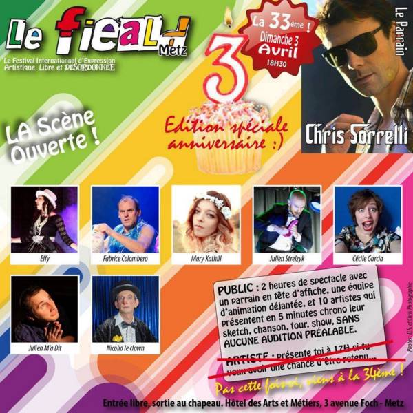 Les festivités se dérouleront dimanche 3 avril à 18h30 à L’Hôtel des Arts et Métiers de METZ, 3 avenue Foch à Metz. Exceptionnellement il n’y aura pas d’inscription le jour même car la programmation réunit des figures artistiques variées de notre cher Lorraine, mais nous invitons les Artistes à venir fêter avec nous et à nous présenter leurs exploits à la prochaine édition, dimanche 1er mai.