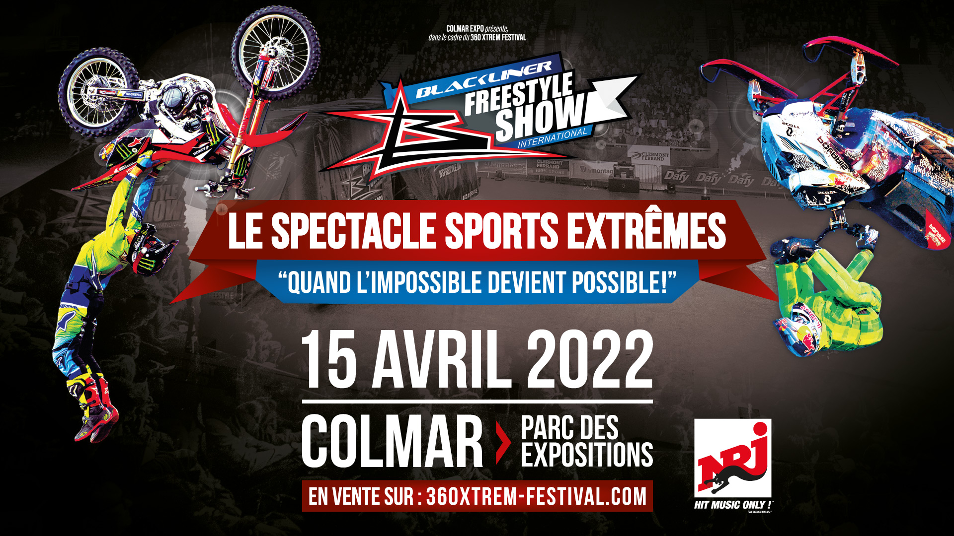 Vendredi 15 avril 2022, Colmar se transformera à nouveau en capitale des sports extrêmes avec la tenue du 360 XTrem Festival #4, son nouveau spectacle, Blackliner Freestyle Show, et les plus grandes stars mondiales des disciplines freestyles proposées : moto, BMX et motoneige ! Cette année encore, les meilleurs mondiaux seront présents : le suédois Daniel BODIN, multiple vainqueur aux Winter X Games, et son backflip en motoneige ; le champion du monde allemand, Luc ACKERMANN, pour le premier double backflip en FMX du 360 XTrem Festival ; le jeune prodige belge, Julien VANSTIPPEN ; le suisse multi-titré et sa motocross électrique, Mat REBEAUD ; le top France actuel avec Nicolas TEXIER et Julien MANNON ; notre régional de l’étape, Alain BURCKLEN ; et pour les amateurs de deux roues sans moteur, ce sera Patrick GUIMEZ en BMX, pour tenter le double frontflip (tête vers l’avant) !