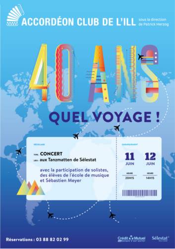 Cette année l’ACI a le plaisir de fêter ses 40 ans. Au programme musical , un tour du monde avec la participation de divers artistes, chanteurs et danseurs, tels Sébastien Meyer, Anaël, Bourvil…. Ce spectacle se fait également avec le concours des élèves de l’école de musique Patrick HERZOG.