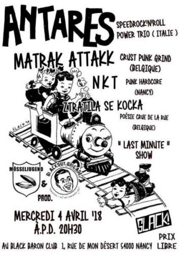 Antares, groupe speedrock italien, débarque à Nancy le 4 avril. Ils seront accompagnés de Matrak AttaKK, formation crust belge, de NKT, du punk hardcore de Nancy et également Ztratila Se Kocka, poète mélancolique de Bruxelles.