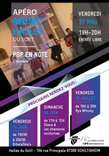 Dans le cadre des rendez vous "Apéro Musci’Halles", venez écouter le groupe Pop en notes (classique) du Secours Populaire de 19h à 20h dans les Halles du Scilt pour un apéro-concert.