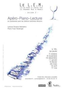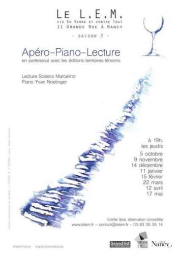 Le LEM et les Editions Territoires Témoins vous proposent un jeudi par mois des Apéros Piano Lecture, un moment festif littéraire et musical à savourer entre amis. Prochain rendez-vous le jeudi 12 avril à 19h30.