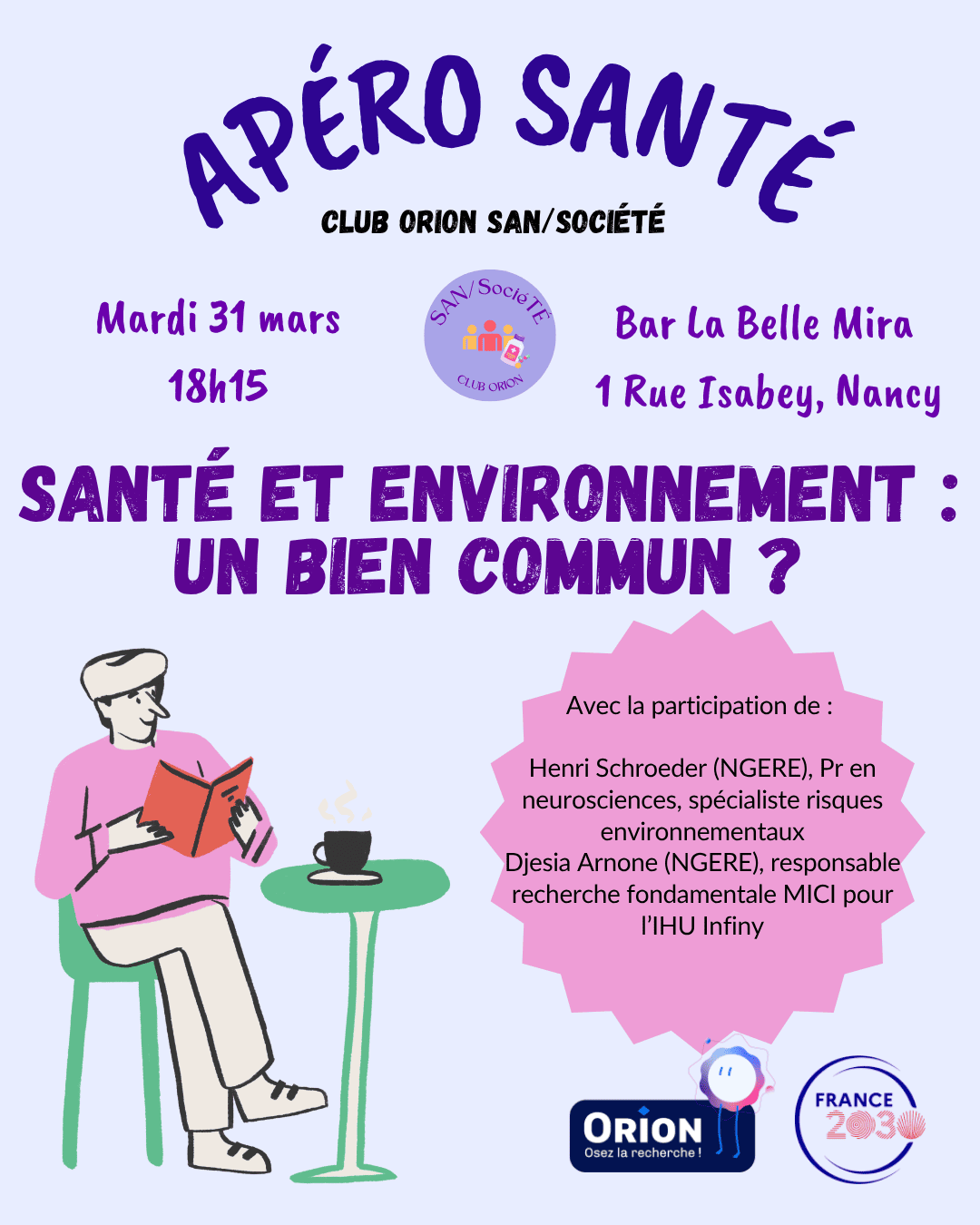 Cette discussion du club ORION San/sociéTé aura pour objectif de nous interroger sur la notion de « One Health » (ou « une seule santé ») qui englobe la santé des hommes, des animaux et de la terre. Si cette préoccupation de lier santé et environnement est très ancienne et que l’on met en relation le corps et la nature dès l’Antiquité (avec Hippocrate par exemple), elle est aujourd’hui centrale dans un contexte où les pandémies tendent à se multiplier. Pour questionner cette notion et les enjeux qui l’entourent, nous aurons le plaisir d’échanger avec Djesia Arnone (NGERE), responsable de recherche fondamentale sur les maladies inflammatoires chroniques de l’intestin pour l’IHU Infiny et Henri Schroeder (NGERE), professeur en neurosciences et spécialiste des risques environnementaux.