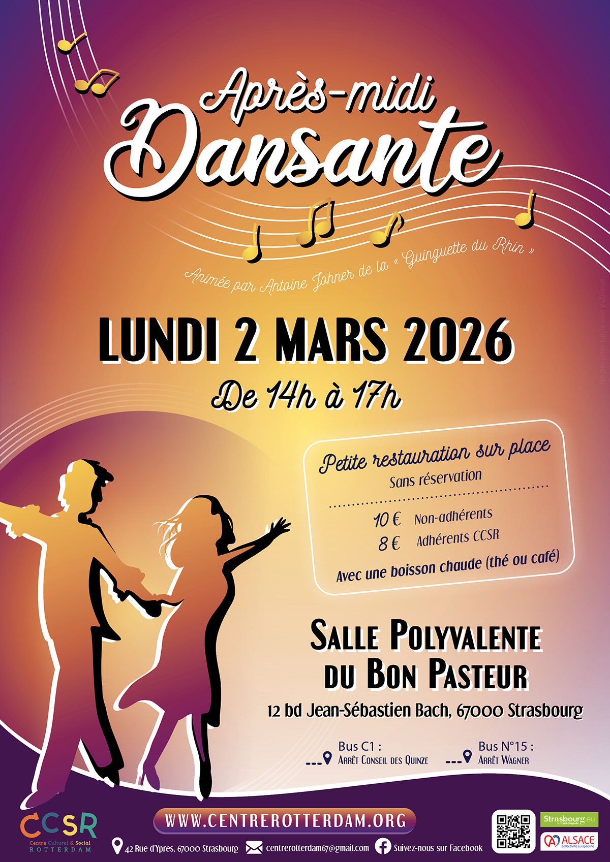 Après plusieurs éditions effervescentes, le Centre Culturel et Social Rotterdam réitère son après-midi dansante le lundi 2 mars 2026, pour encore plus de plaisir ! De 14h à 17h, tous les amoureux de la musique sont les bienvenus à la salle polyvalente du Bon Pasteur, au 12 boulevard Jean-Sébastien Bach à Strasbourg.