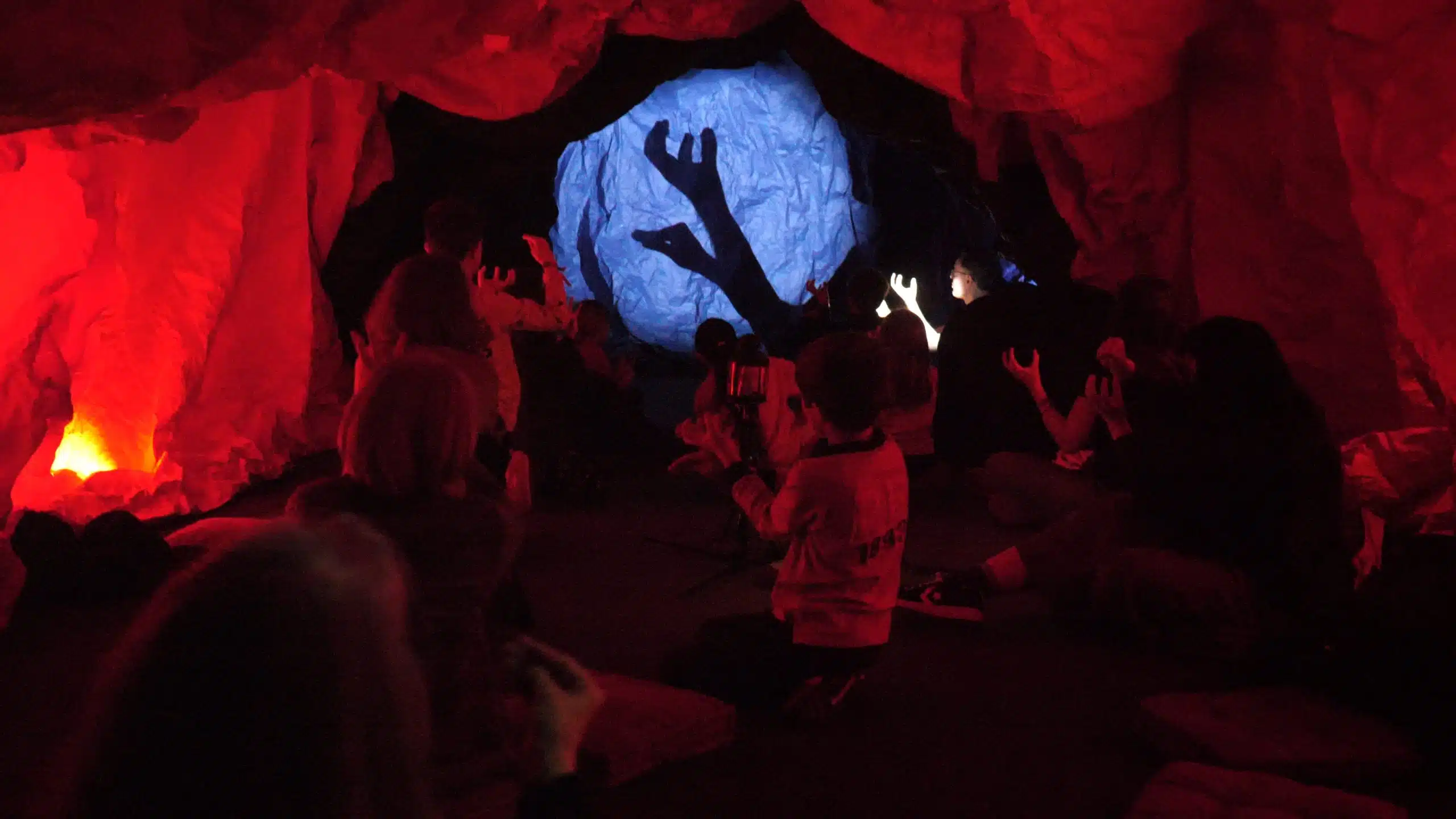C’est un lieu où entrer dans la pénombre. A l’oreille, se perçoivent un crépitement, un bruit minéral, des sons de la nature, foisonnants. L’œil enfin s’ajuste à la lueur d’un feu hypnotique, matrice lumineuse qui invite à la découverte, à la contemplation. Nous sommes dans une grotte. Faite de papier par Céline Diez, elle convoque la mémoire archaïque et fantasmatique de temps pourtant immémoriaux, celle de l’époque première, notre préhistoire. Sur ses parois noires comme la nuit, ombres et dessins apparaissent, s’animent et s’évanouissent dans les plis du papier, rappelant le lien primitif qui unit l’homme à la nature mais aussi à la création. Au côté des projections de Clément Debailleul, un ballet de mains de l’ombromane Philippe Beau donne vie à diverses figures, animales, végétales, qui se succèdent et se transforment à la vitesse d’un morphing. Il s’agit d’un véritable cinéma des origines où les silhouettes se créent au rythme des mouvements gracieux et fluides des doigts qui s’entrelacent. Jouer avec l’ombre est un acte magique de dialogue avec l’invisible, de réenchantement du monde et de connexion avec la nature. Cette expérience immersive et poétique de la nuit des commencements offre le privilège de cette magie.