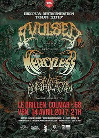 Mercyless veritable groupe culte de la scene Death Metal Française ,celebre a travers cette tournée les 30 ans du groupe .Avec un nouvel album sous les bras ( sortie chez Kaotoxin Rec. En Nov 2016) encenssé par la presse et les medias le groupe a hate de venir defendre ces compos en ces propres terres .A noter que pour feter dignement cet anniversaire un split ep 7 Mercyless /Avulsed avec 2 morceaux enregistrés pour l’occasion seront proposés lors de cette tournée !!!! Pure Unholy Death Metal !!!