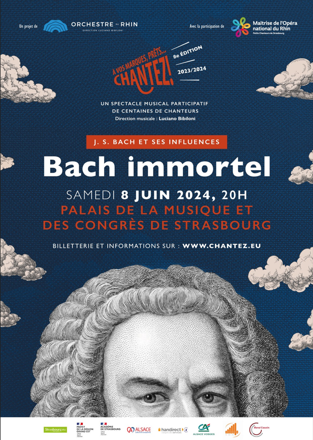 « A vos marques, prêts… Chantez !" est une aventure collective, projet unique qui rassemble un public intergénérationnel et citoyen de chanteurs amateurs et professionnels autour de concerts participatifs. Objectif : Un moment musical de qualité où plus d’un millier d'interprètes, jeunes et moins jeunes, écoliers et parents, sont guidés par les jeunes voix strasbourgeoises de la Maîtrise de l’Opéra national du Rhin et par le brillant Orchestre du Rhin. Dirigés par Luciano Bibiloni, ils donneront pour l’édition 2024 plusieurs concerts dont cette version hors du commun de la musique de Bach, mais également d’autres surprises... notamment des quodlibets superposant les plus célèbres thèmes de Bach à d’autres mélodies !