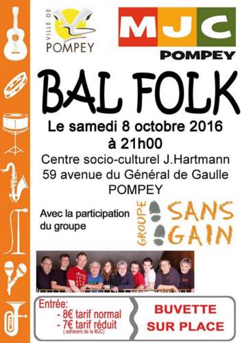 La MJC de Pompey organise un Bal Folk, le samedi 8 octobre 2016 à 21h00 au centre socioculturel de Pompey avec la participation du Groupe SANS GAIN