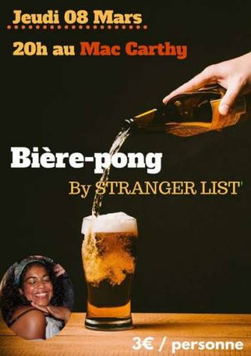 Les rallye bock ne t’ont pas encore dégoutter de la bière - La STRANGER LIST’ est encore une fois la pour toi : on te propose de venir défier les plus grands joueur (coucou Aubin et Fabiche) de bière pong ce jeudi au Mac Carthy dans une ambiance festive et joyeuse. Et tout ça pour la maudite somme de 3euros/ personne.