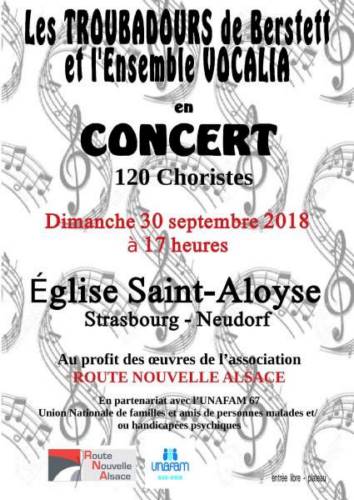 L’UNAFAM67 organise un concert avec plus de 120 choristes ce dimanche 30 septembre 2018 en l’église Saint-Aloyse de Strasbourg (Neudorf), 127 rue du Polygone, à 17H.