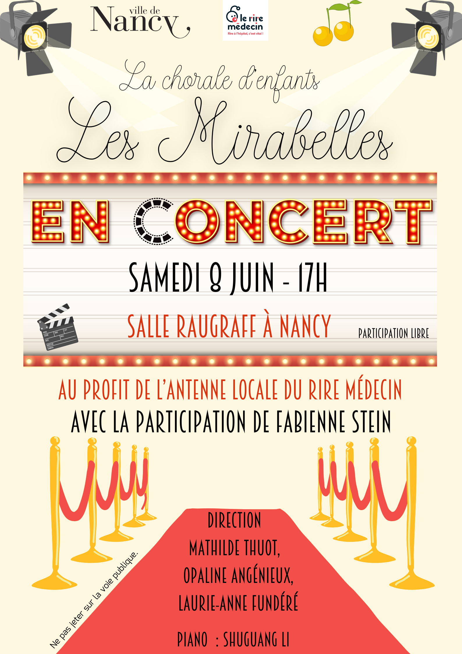 La chorale d'enfants "Les Mirabelles" est heureuse de vous inviter à fouler son tapis rouge le samedi 8 juin à 17h, salle Raugraff à Nancy. Les choristes de 3 à 13 ans vous présenteront leur programme sur le thème du cinéma, accompagnés au piano par Shugang Li et à la voix par Fabienne Stein.