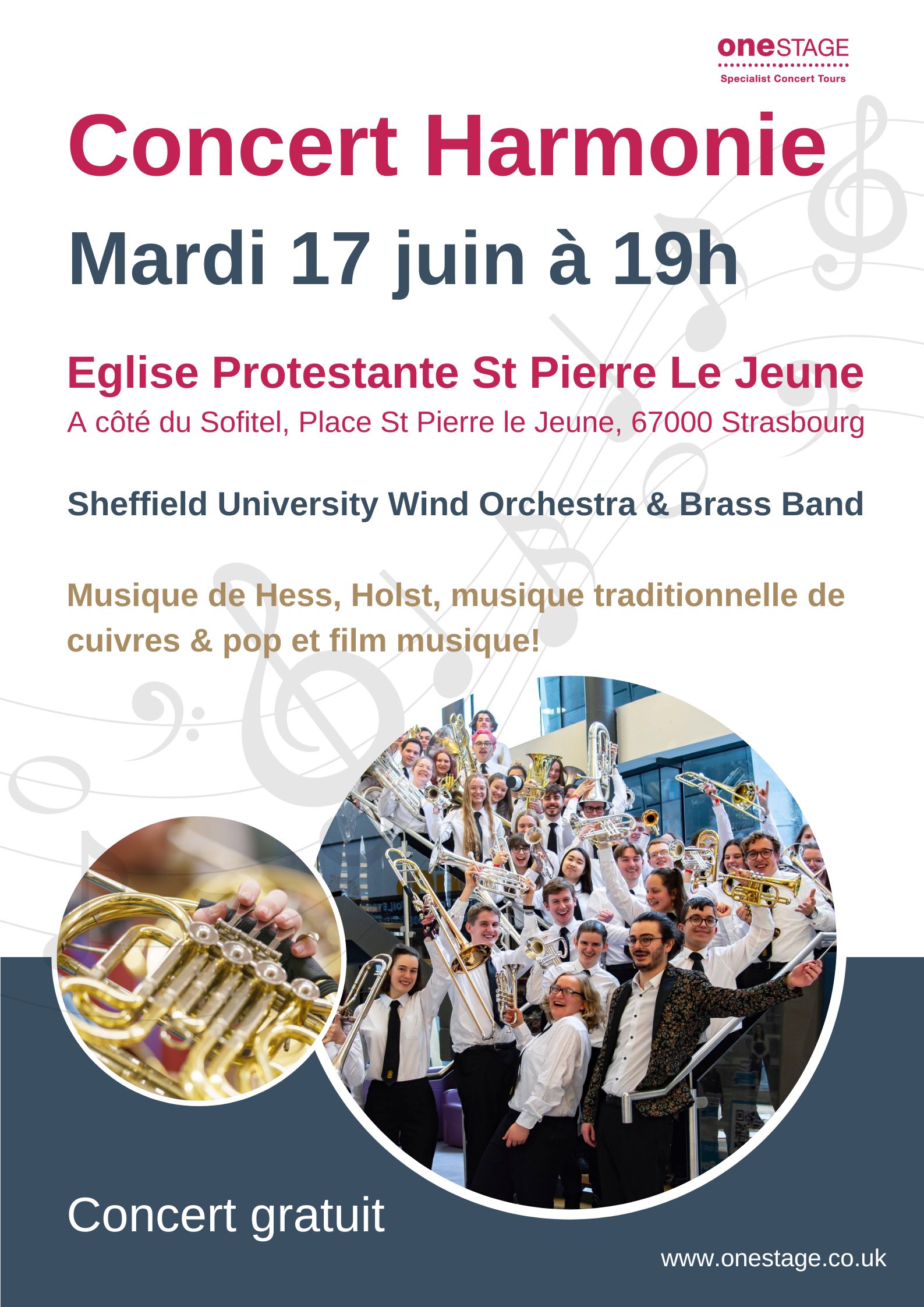 Un concert gratuit aura lieu le mardi 17 juin à 19h à Strasbourg. C'est un orchestra d'harmonie fantastique de jeunes musiciens qui se produisent à l'Eglise Protestante St Pierre Le Jeune - a côté du Sofitel, Place St Pierre le Jeune, Strasbourg. Concert pour toute la famille avec musique traditionelle de cuivres, & pop et film musique, entrée libre.