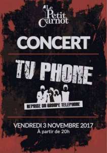 Salut tout le monde ! Vous adorez les chansons du groupe Téléphone - Alors le rendez vous se trouve au petit carnot le vendredi 3 novembre à partir de 20 h ! Le groupe TV phone reprend téléphone pour vous faire passer une soirée de folie alors venez nombreux les encourager et danser sur le rythme du groupe de rock mythique ! ????