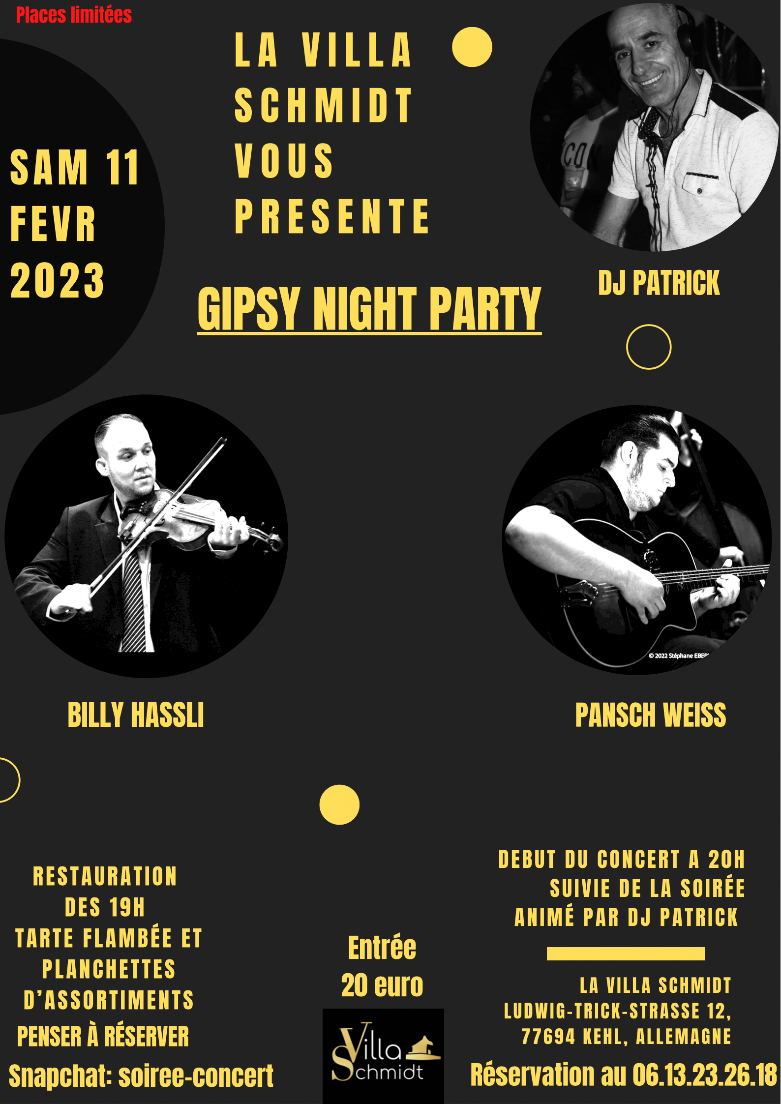 La villa schmdit vous propose une soirée Jazz Funk Rnb inoubliable en deux parties avec en première partie un concert avec des muscisien très talentueux Billy Hassli (violon) et Pansch Weiss (guitare) qui joueronts leur répertoire Ainsi que des reprises conue puis Dj Patrick va enflammer la piste de danse avec c'est talents qu'on ne présente plus venez vibrer et vous amuser jusqu'au bout de la nuit attention les places sonts limitées réservation par téléphone au 06.13.23.26.18 merci cordialement