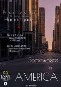 L’ensemble vocal Hamadryade dirigé par Adam Harrata nous invite le temps d’une soirée à nous plonger dans le paysage musical américain. Sans se vouloir exhaustif, le programme "Somewhere in America" parcourt divers aspects de la musique des États-Unis, de la plus savante à la plus populaire.