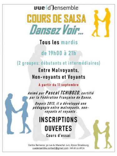 Reprise des cours de salsa Dansez Voir, entre malvoyants, non-voyants et voyants. Tous les mardis de 19h à 21h pour débutants et intermédiaires à partir du 11 septembre 2018, cours d’essai gratuit.