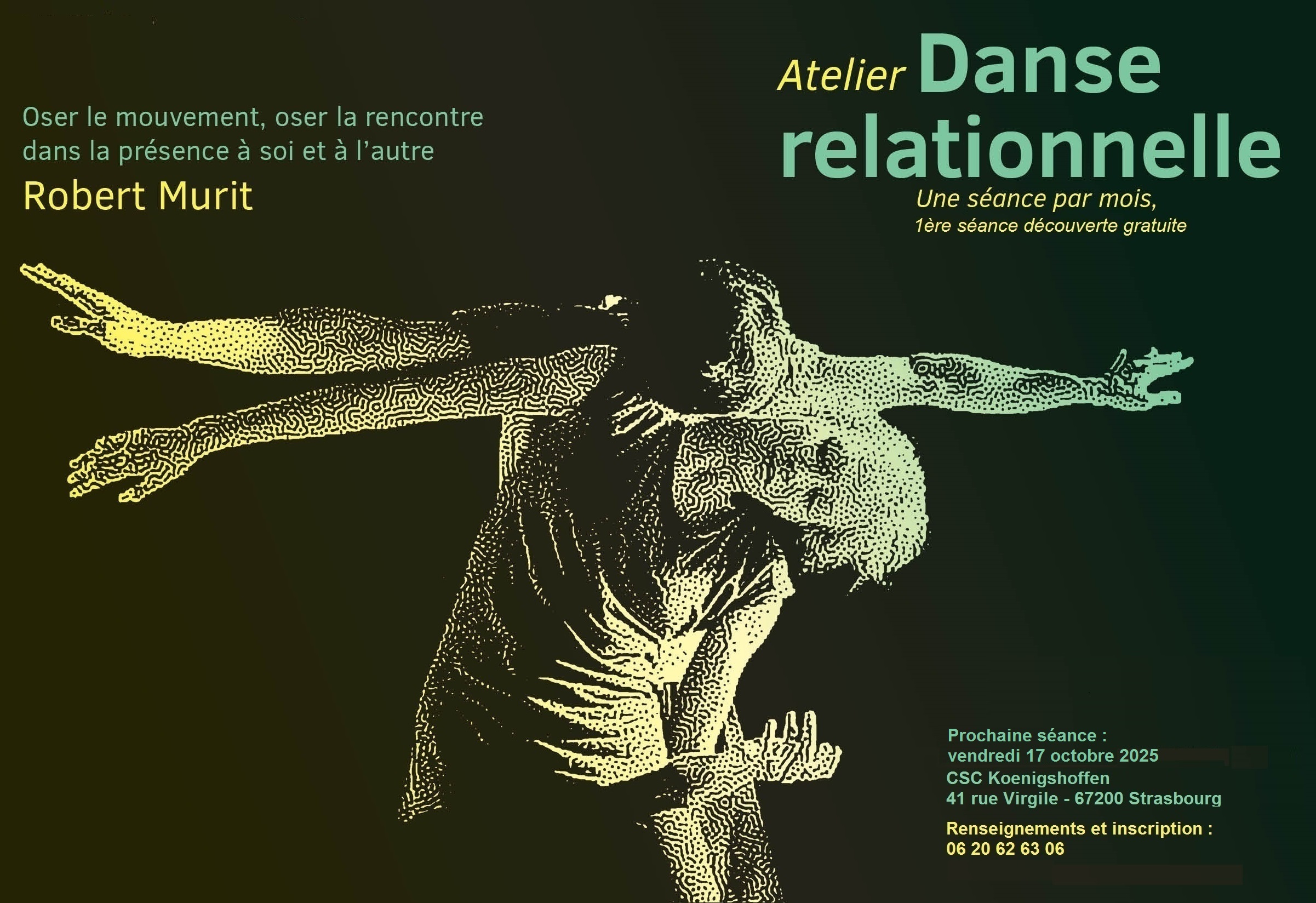 C’est aussi un travail de rencontre. Être à l’écoute de l’autre, le sentir, comprendre ce qu’il exprime, apprendre à s’ajuster à son rythme, le suivre ou induire un mouvement différent plus créatif. Chercher le geste juste pour s’accorder, créer ensemble un seul et même mouvement. Vivre alors le plaisir d’un moment d’harmonie. La bienveillance et la bonne humeur du groupe permettent rapidement de trouver sa place, son style et se sentir à l’aise. Le pari n’est-il pas d’accepter ce qu’il advient, ce qui se déroule sous mes yeux et de réaliser que j’ai le choix de reproduire ou d’oser le nouveau ?