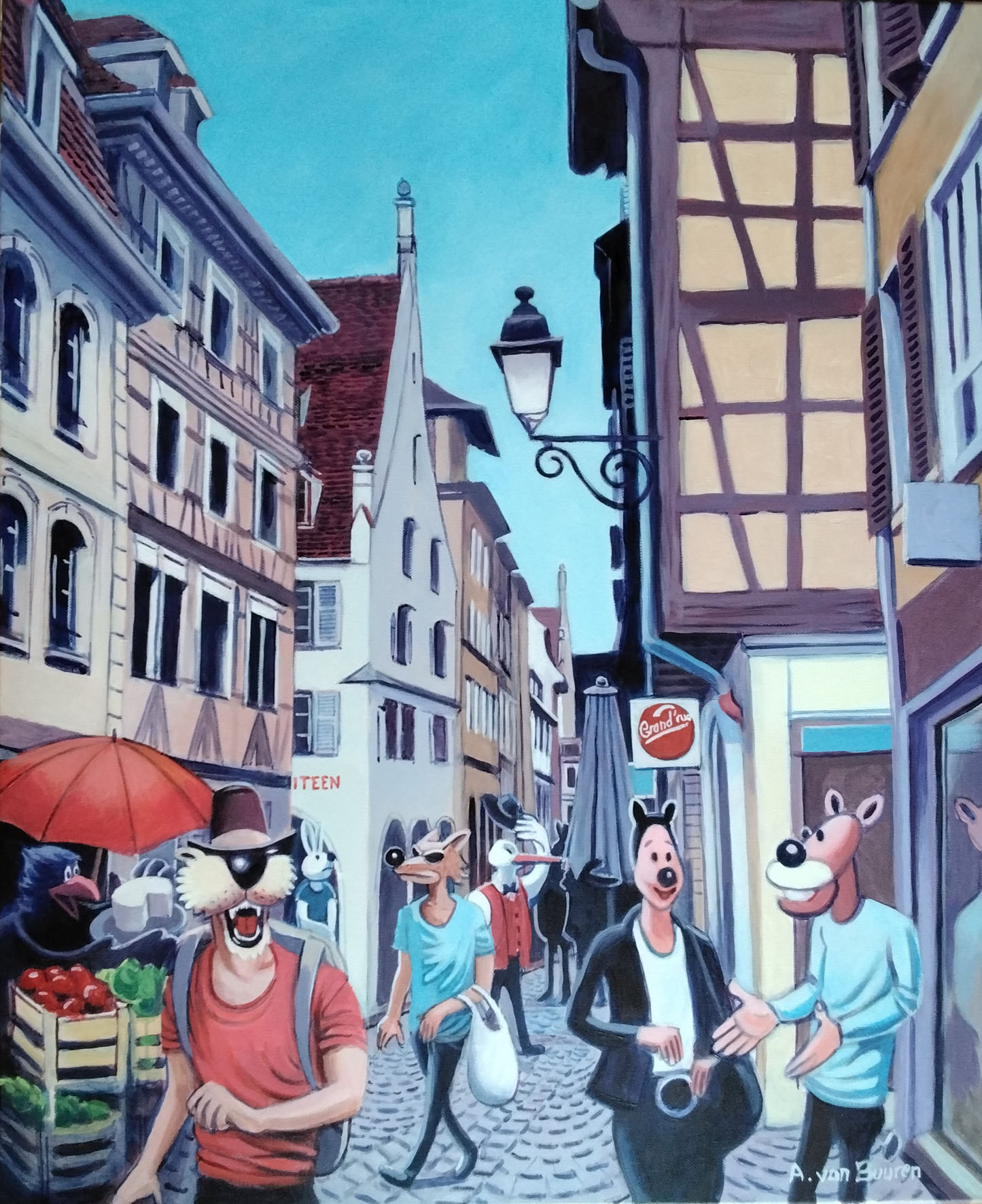 Cette fois, il a apporté des réalisations prenant pour cadre bien connu la grand’rue à Strasbourg, peuplée par les animaux personnifiés qui font désormais partie de sa marque de fabrique. Les scènes sont animées et bigarrées, parcourues d’une verve toute narrative, style BD, qui leur donne leur caractère de fable visuelle.