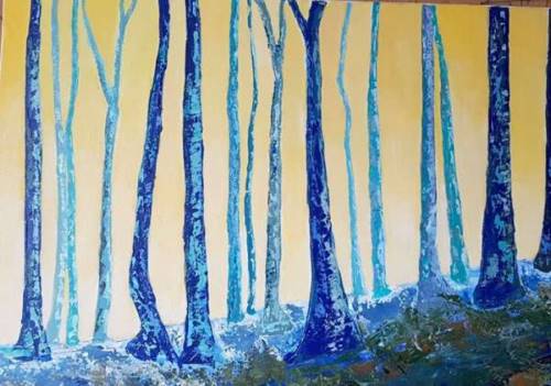 • Avec une palette généreuse, elle propose des compositions qui multiplient les aplats. L’artiste taille au couteau des zones de couleurs qui laissent apparaître quelques-uns des cernes à la craie du travail préparatoire. Les effets de transparence procurent la transparence et la lumière. La toile vit sous nos yeux.