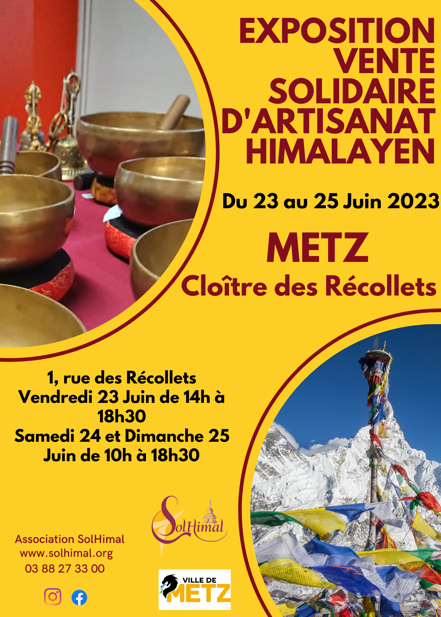 Venez retrouver l'équipe de l'association SolHimal, pour la première fois à Metz, pour une exposition vente exceptionnelle d'artisanat Himalayen. Des bols chantants, de la papeterie, des vêtements, en passant par les thés et épices et les objets en papier machés et peints à la main, nous avons certainement quelque chose qui va vous plaire ! Notre équipe sera aussi disponible pour vous renseigner sur notre association et le parrainage d'enfants, de personnes agées ou de moines ou nonnes.