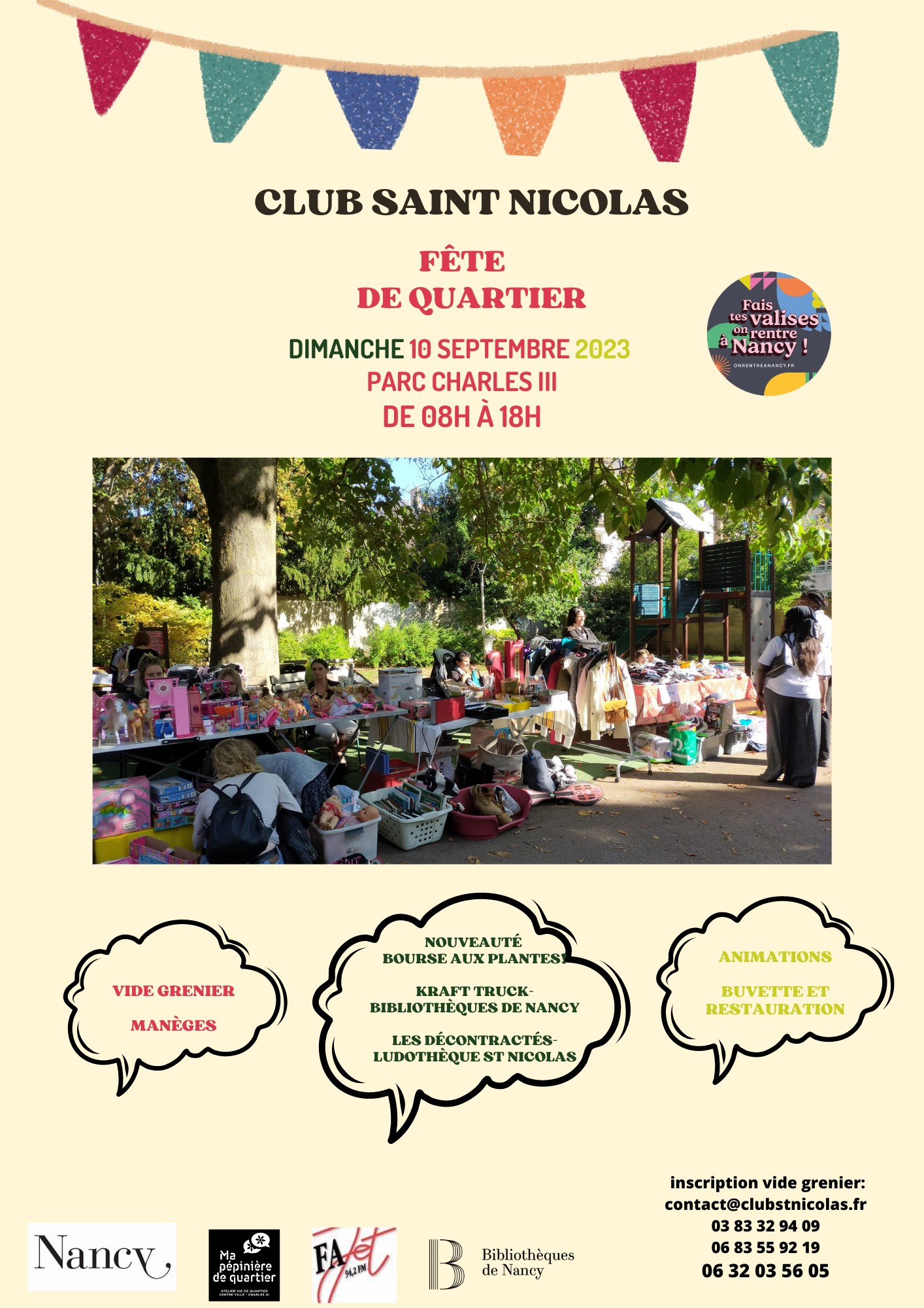 Inscriptions au vide-greniers : contacter le Club Saint Nicolas - contact@clubstnicolas.fr - 0383329409 - 0683559219 - 0632035605