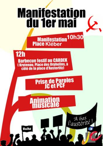 Cette année, comme depuis 2008, les Jeunes Communistes du Bas-Rhin organisent leur fête du premier mai, journée internationale des travailleurs, au CARDEK place des orphelins à Strasbourg.