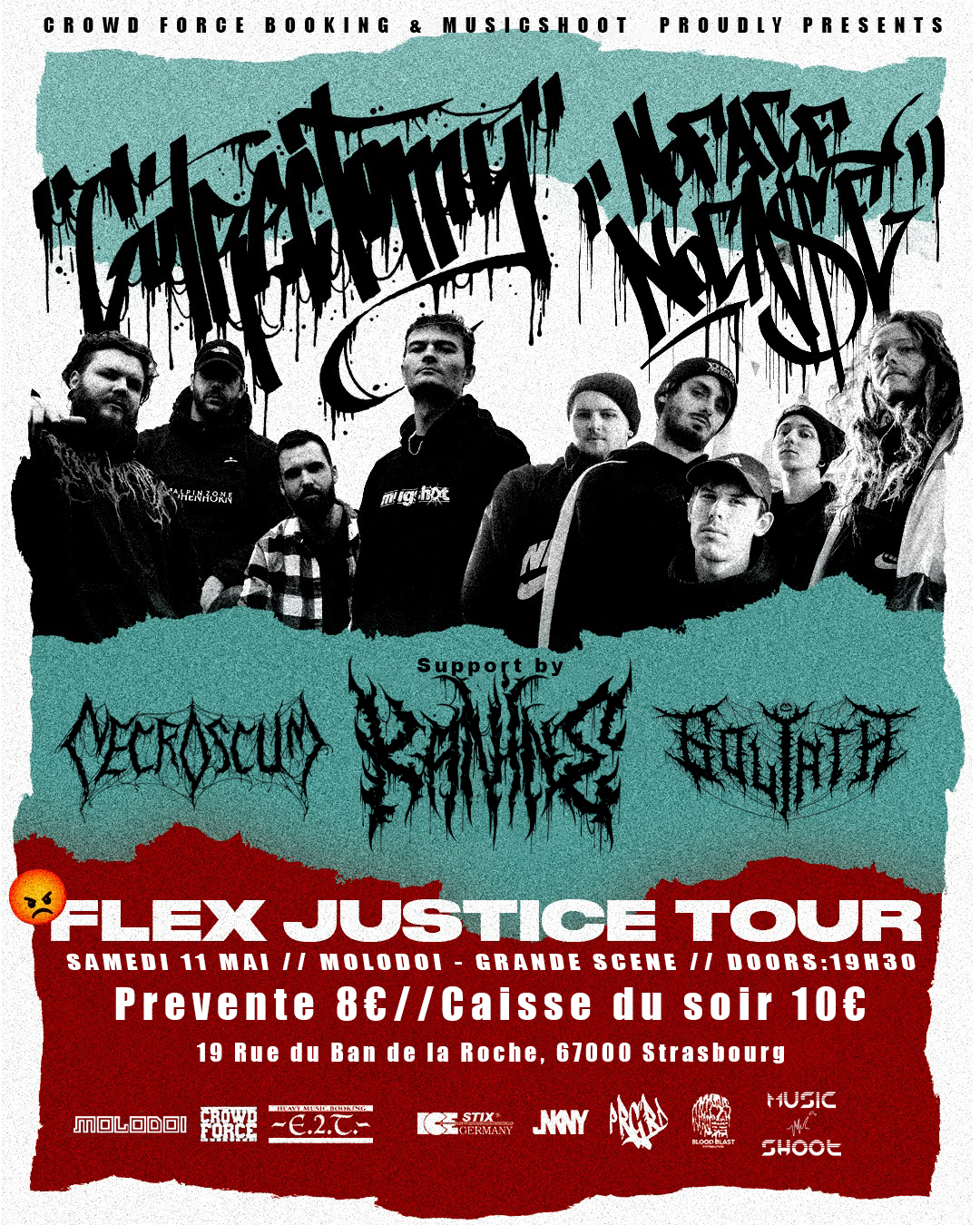 A l'occasion de la tournée FLEX JUSTICE, l'association Music Shoot investit la grande scène du Molodoi et invite Gutrectomy et No Face No Case. Les trois groupes locaux Kanine, Necroscum et Goliath s'ajoutent a cette affiche pour une bagarre aussi lourde que festive.