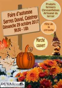 Les serres DUVAL de Ceintrey sont heureuses de vous inviter à leur prochaine foire d’automne, le dimanche 29 octobre de 9h30 à 18h.
