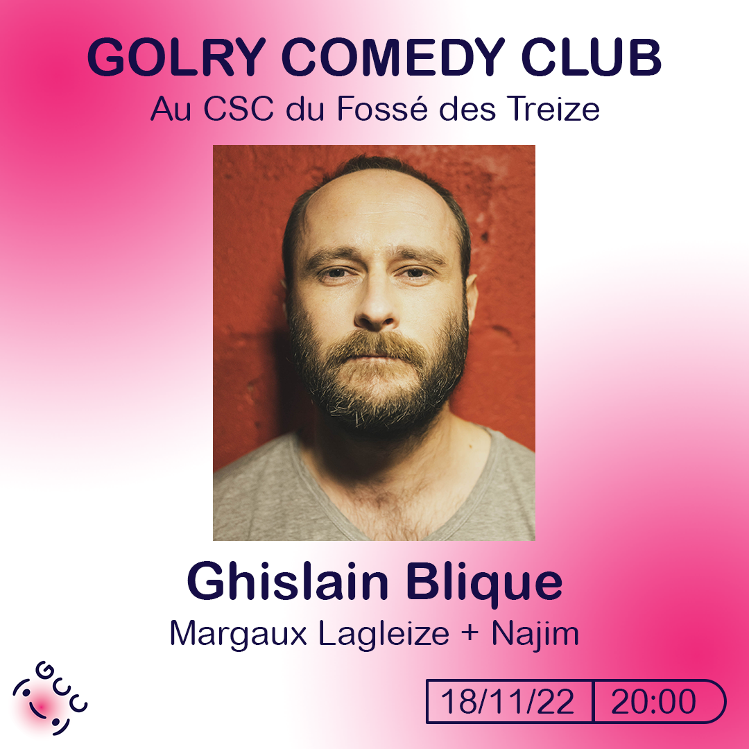 Ghislain Blique sera au Fossé des XIII le 18 novembre pour le Golry Comedy Club ! Régulier du Paname Comedy Club, son spectacle "Plus rien à branler" était programmé tous jeudi d'août cet été au Point Virgule. Venez découvrir son humour et son phrasé si particulier ! Margaux Lagleize et Najim seront les premières parties de cette soirée et vous feront chauffer les zygomatiques !