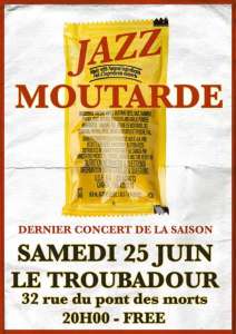 Avant la trève annuelle des concerts du Troub, pour clore la saison musicale et feter la fin des exams, on vous donne rendez vous le 25 juin, juste après l’happy hour, pour le concert des mythiques Jazz Moutarde!!!