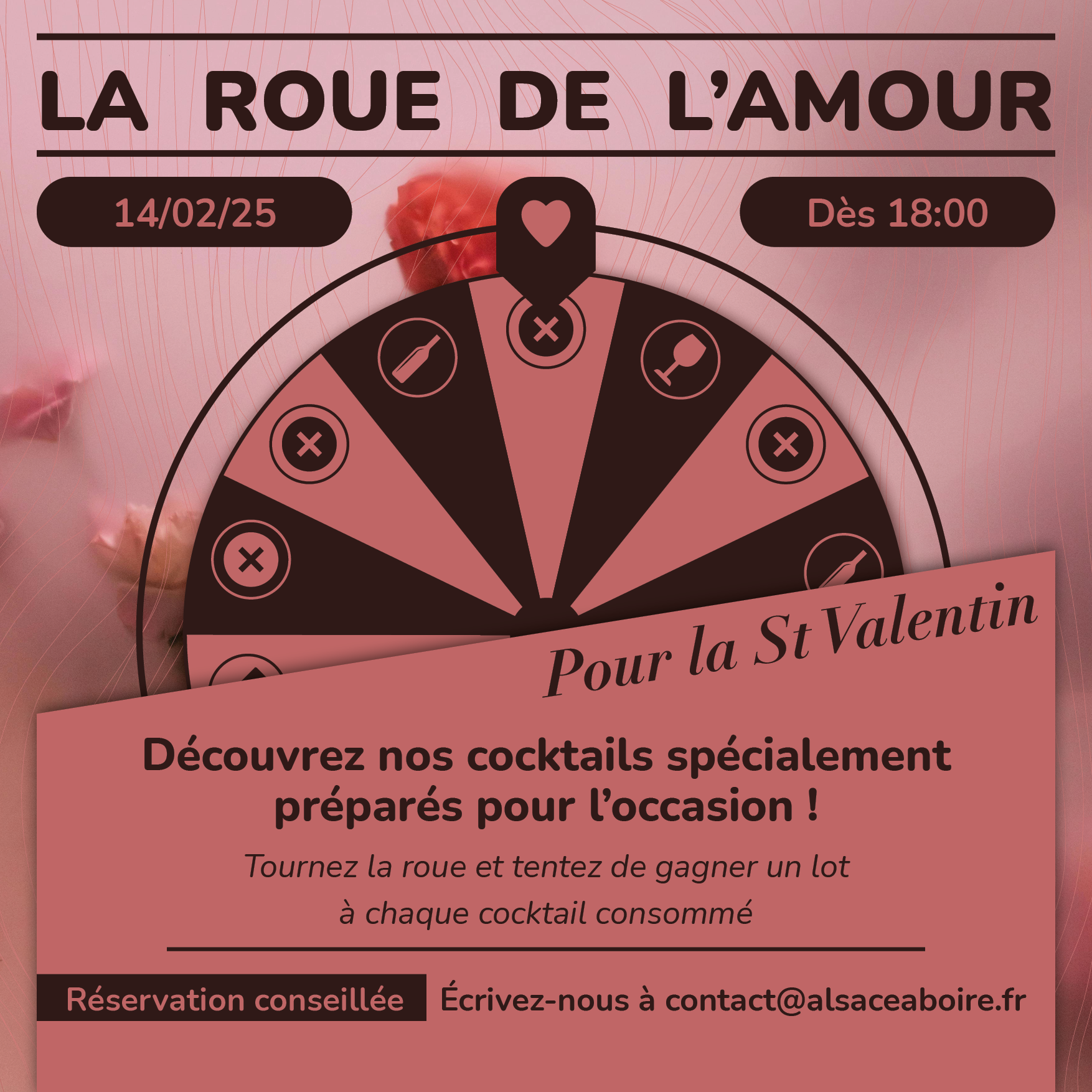 Oui, pour célébrer la Saint-Valentin comme il se doit, on vous invite à jouer à la Roue de l’Amour🎰 Pour chaque cocktail Saint-Valentin que vous commandez, vous aurez droit à un tirage de roue avec de superbes lots à la clé… 🎁 🍷