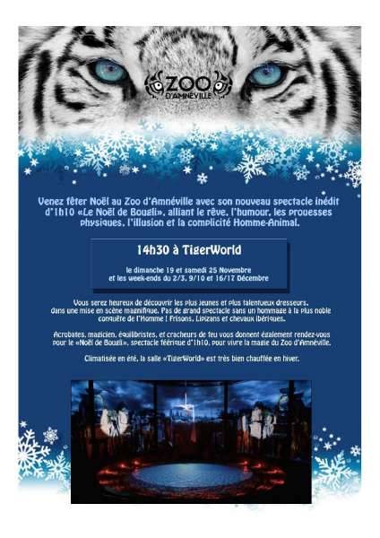 Venez fêter Noël au Zoo d’Amnéville, avec son nouveau spectacle inédit d’1h10 "Le Noël de Bougli", alliant le rêve, l’humour, les prouesses physiques, l’illusion et la complicité homme-animal.