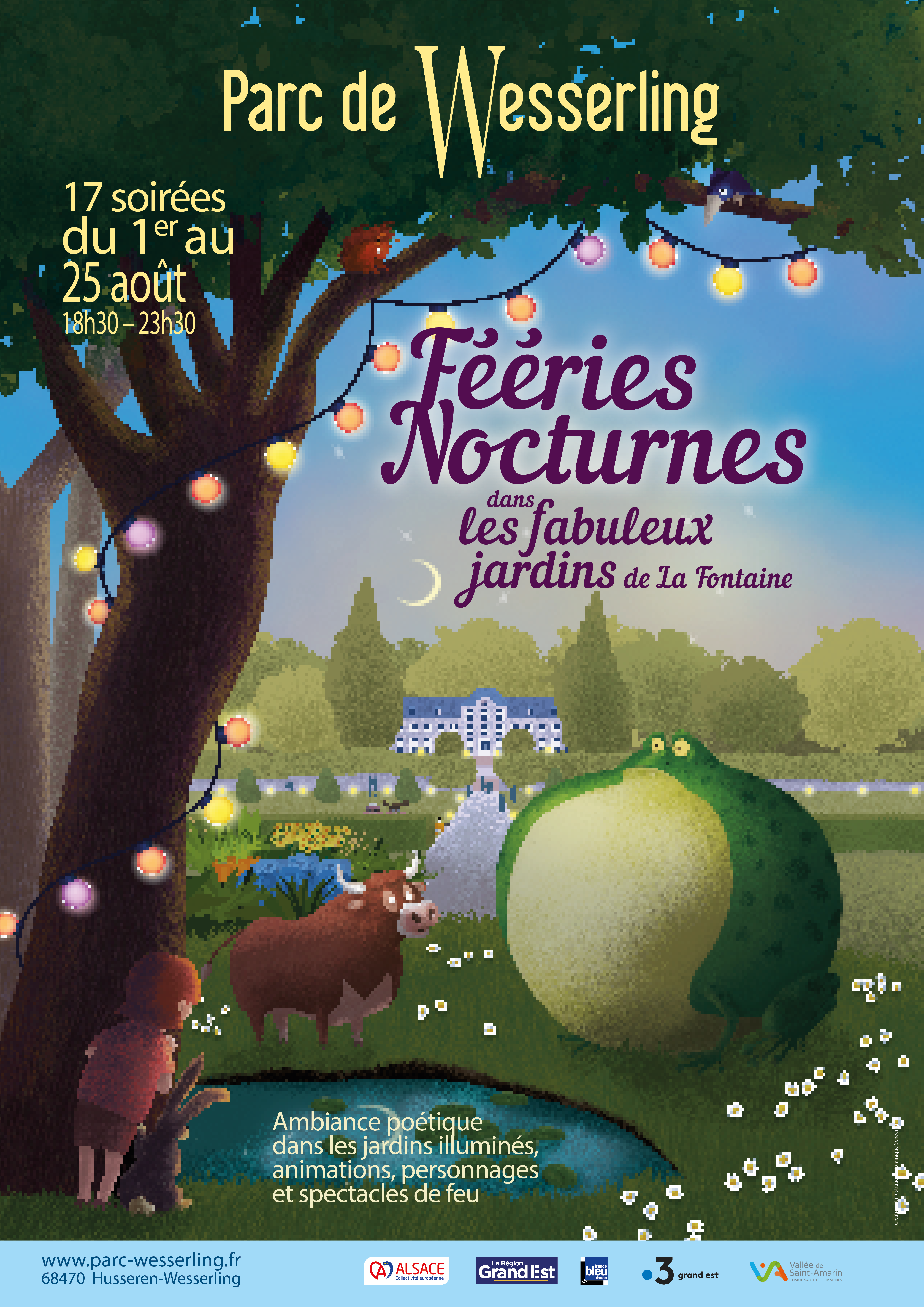 Quand la féerie des nuits d’été s’invite à Wesserling, les jardins s’illuminent et les sens s’éveillent dans un parc où tout devient magie. Vous découvrirez les Jardins du Parc de Wesserling comme vous ne les avez jamais vu : ambiance magique et colorée, sons et lumières d’ambiance. D’aventures en rencontres, vous partirez résoudre de nombreuses énigmes pour retrouver la fable secrète ! Vous pourrez également profiter de ces soirées pour découvrir et passer un agréable moment dans les Jardins du Parc de Wesserling illuminés... ✨??