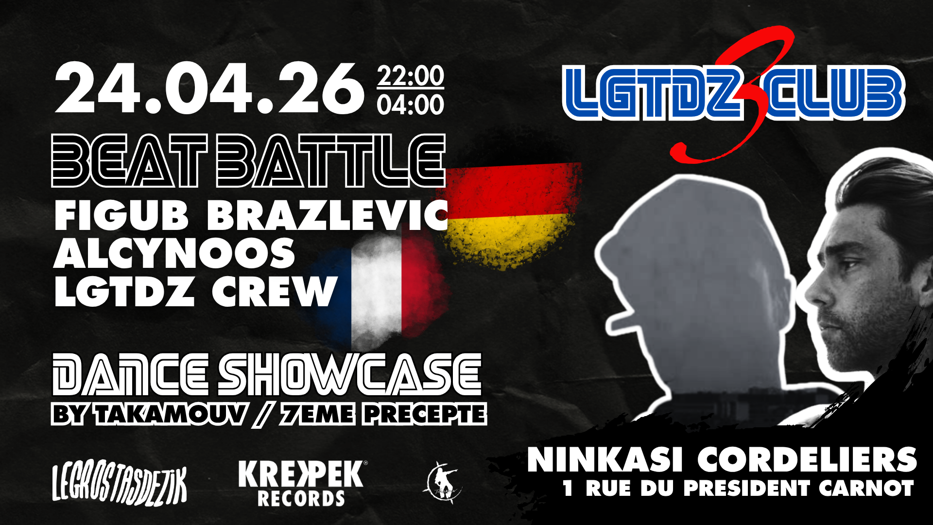 Pour cette édition, LGTDZ fait la part belle aux grooves et aux machines. Suite aux passages de De Phase & Neue Grafik, puis Mofak & Hudge, le LGTDZ Club poursuit son cycle au Ninkasi Cordeliers. Des machines allumées, du monde autour, et des idées qui prennent forme en direct. La soirée rassemble plusieurs approches du son : le beatmaking avec Figub Brazlevic (Berlin) et Alycnoos (Paris), deux proches de LGTDZ régulièrement croisés sur ses ondes et ses événements, aux côtés du LGTDZ Producers Crew (Lyon), dans une logique collective. Un showcase de danse porté par l’école Takamouv et le collectif 7ème Précepte vient prolonger cette matière sonore dans le mouvement. Un DJ set s’inscrit dans la même continuité. Le point commun reste simple : du son maison et le partage sans détour.