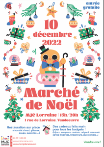La MJC Lorraine tiendra son Marché de Noël de 15h à 20h, où vous pourrez trouver des gourmandises à manger et à boire et des idées de cadeaux faits main, par des créateurs locaux (jeux en bois, sculpture, aquarelle, bougeoirs, couture, linogravure, illustrations, bijoux, déco, macramé …)