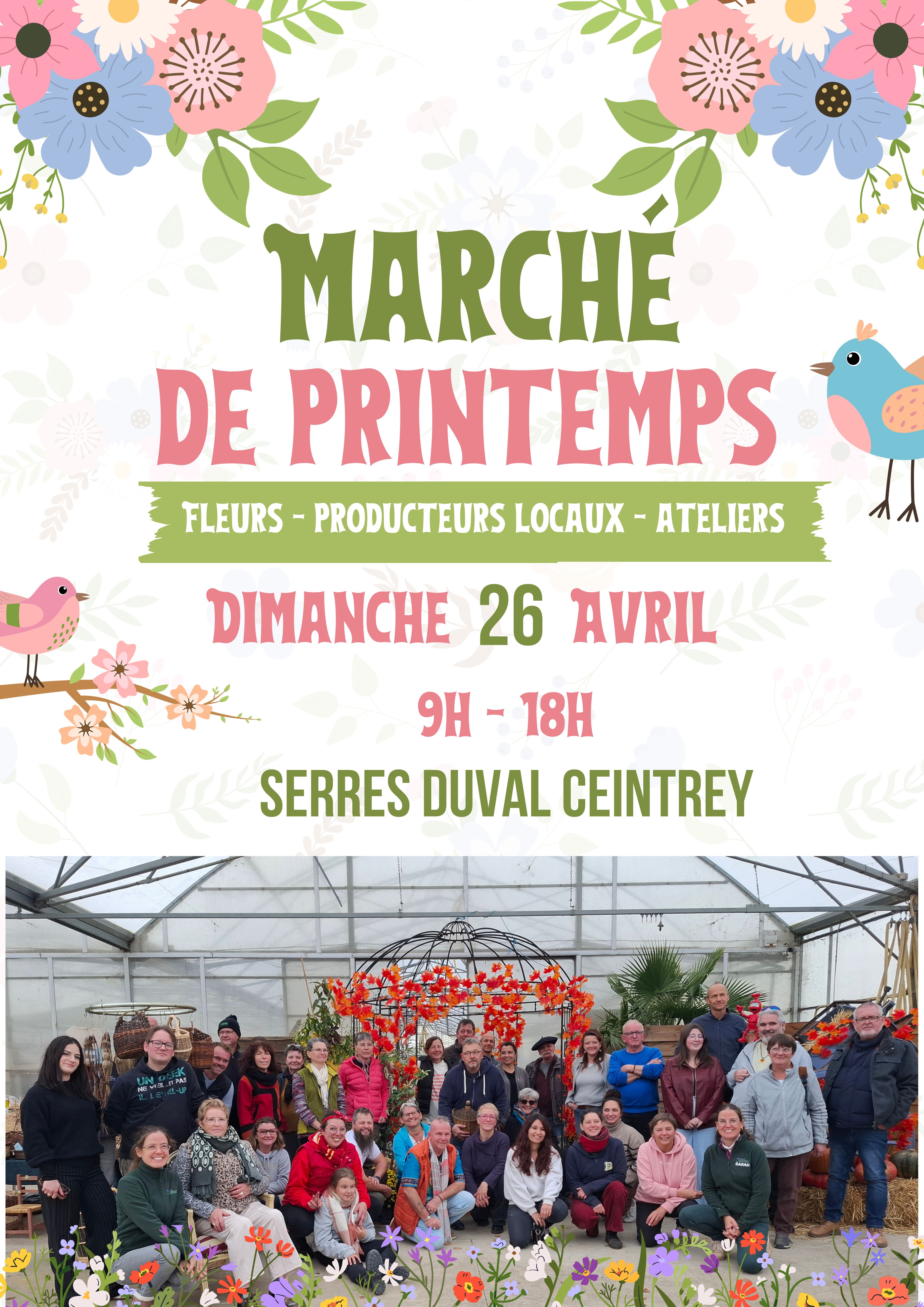 Les serres Duval sont heureuses de vous convier à leur traditionnel marché de printemps le dimanche 26 avril de 9h à 18h. Ce sera l'occasion de découvrir ou redécouvrir une trentaine d'exposants, visiter les serres parées de milliers de plants de fleurs et de légumes. Vous pourrez également vous restaurer ou participer à des ateliers. De jolies surprises vous attendent! Alors à vos agendas!