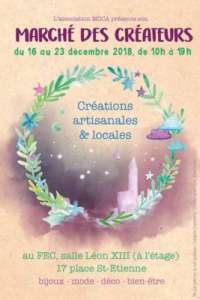 Plus d’une vingtaine de créateurs locaux vous donnent rendez-vous au FEC 17 place St Étienne (centre ville) pour leur marché de Noël. Durant 8 jours non stop ils vous présentent leurs créations 100% faites main au premier étage, dans la magnifique salle Léon XIII. Bijoux, mode, décoration, bien-être… Des centaines d’idées cadeaux originaux vous attendent au chaud et au sec !