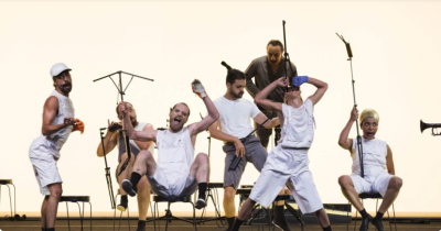 La Capverdienne Marlene Monteiro Freitas convoque Dionysos et ses Bacchantes dans un « Prélude pour une purge » peuplé de pastiches, de musiciens et de danseurs jouant les automates d’un carnaval dada. Sur un plateau en 16/9, la chorégraphe déploie des bulles d’imaginaire au milieu de pads et d’une nuée de pupitres servant, au gré de métamorphoses toutes ovidiennes, de pagaies, d’aspirateurs ou de machines à écrire pour dactylos sous psychotropes ! Entre mouvements de pantins désarticulés et galerie de grimaces, l’œuvre, cadencée par une hystérie collective et un bricolage musical hypnotique, devient une folie pulsionnelle de transgression charnelle et sensorielle.