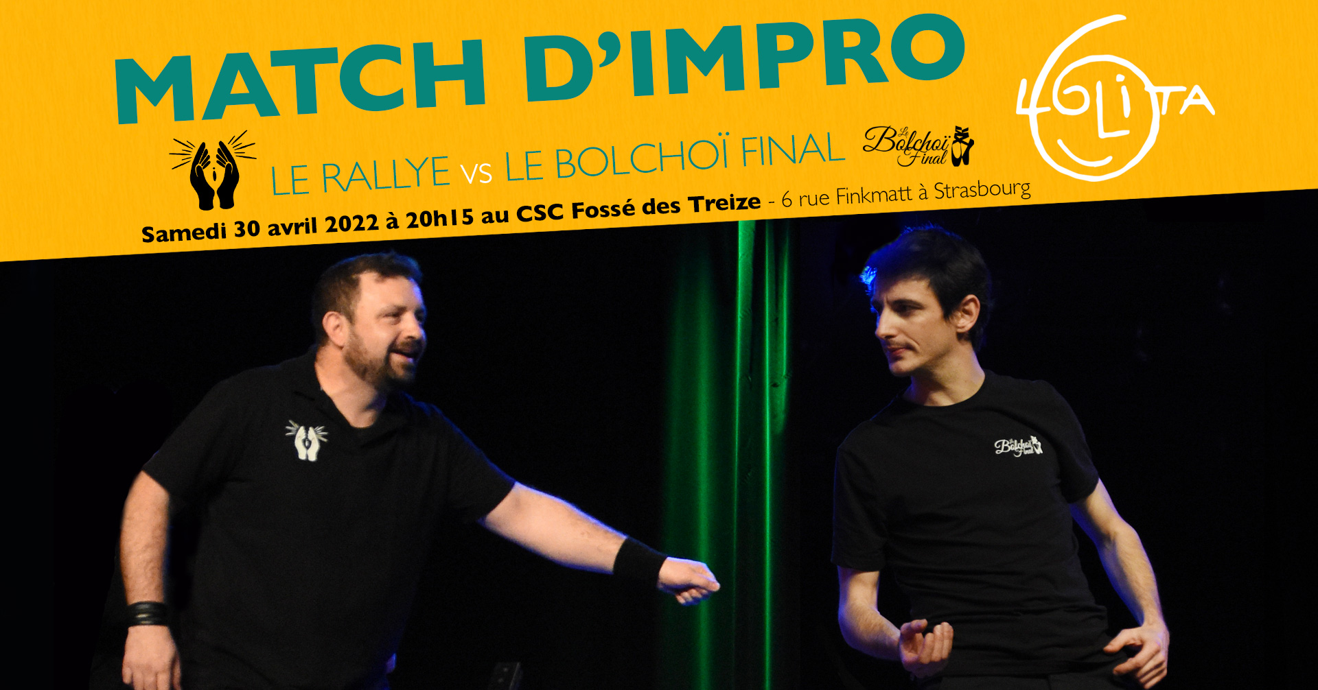 Au dernier jour du mois d’avril, il est de tradition que tous les amateurs de théâtre se suivent en procession vers la salle d’impro du Fossé des Treize, d’après les augures de la Lolita datant de 1523. Une tradition séculaire ordonnée par la reine de Strasbourg, alors à la tête d’une congrégation aux réceptions mêlant danse classique et soirées mondaines. Pour lui rendre hommage, la Lolita organise un match d’impro le 30 avril entre les deux équipes Le Rallye et Le Bolchoï Final. L’équipe du Rallye au sex-appeal débridé adoooore se retrouver entre cousins au 3ème degré pour des soirées mêlant sobriété, amour platonique et catéchisme. Elle rencontrera la fameuse troupe en tutu du Bolchoï Final, les brillantissimes amateurs de pas chassé, entrechats, ballets déboulés et arabesques en grand écart. Qu’attendez-vous pour débouler au Fossé des Treize pour vous rallier à ce pas de deux ? Vous y verrez moult improvisations et rirez aux éclats, foi de Lolita!