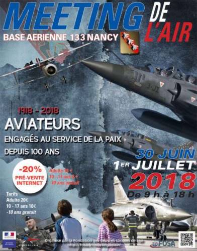 Les 30 juin et 1er juillet 2018, la Fondation des Œuvres Sociales de l’Air (FOSA) organise l’un des deux Meetings de l’Air 2018 sur la base aérienne 133 de Nancy-Ochey. En ce centenaire de la fin de la Première Guerre mondiale, cette nouvelle édition aura pour thème : « 1918-2018, un siècle d’engagement des aviateurs au service de la paix ».