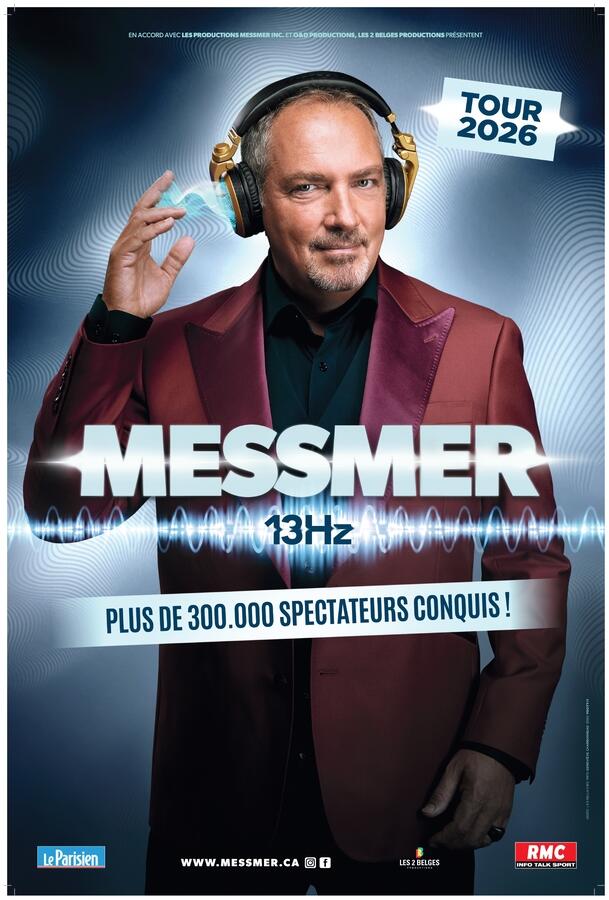 présente :Ne manquez pas votre dernière chance de vivre l'expérience la plus envoûtante du moment ! Le Fascinateur Messmer, maître incontesté de l'hypnose, clôture en apothéose sa tournée 13Hz avec quelques ultimes représentations qui s'annoncent inoubliables.Sur scène, Messmer repousse une fois de plus les frontières du réel. Entre fascination, humour et stupéfaction, il plonge volontaires et spectateurs dans un univers où le cerveau humain révèle tous ses secrets. Un spectacle hors du commun, à la croisée des neurosciences et de l'émerveillement pur, qui a déjà conquis 3 millions de personnes à travers le monde.Après 4 saisons de tournée et plus de 200 dates à travers la francophonie, 13Hz s'apprête à tirer sa révérence - et ces dernières représentations promettent d'être les plus intenses de toutes.13Hz, c'est la fréquence qui sépare l'éveil du sommeil… et ce soir, c'est Messmer qui décide de quel côté vous basculez !