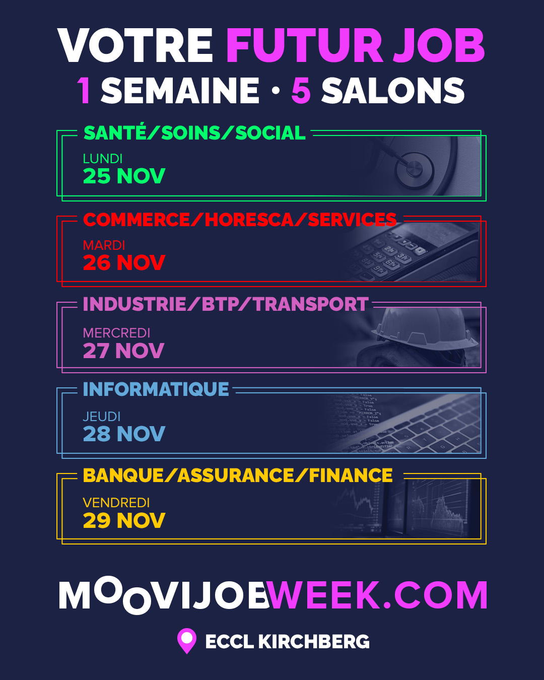 Moovijob.com a le plaisir de lancer une nouvelle initiative pour la première fois au Luxembourg. Découvrez la première édition de la Moovijob Week ! Répartie sur une semaine, cette nouvelle famille d’évènements propose 5 journées thématiques spécialisées :