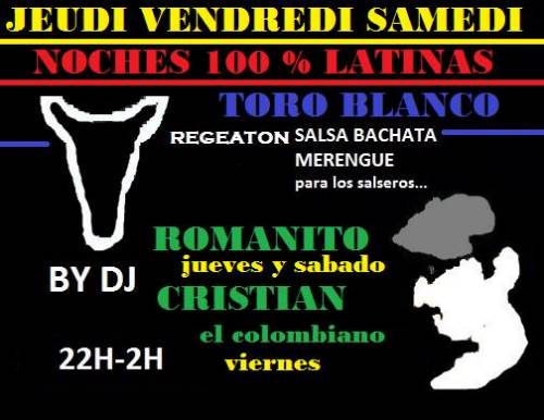 A present du jeudi au samedi les nuits sont calientes et latinas al TORO BLANCO avec DJ ROMANITO et Cristian el colombiano... A BAILLAR MUSICA LATINA...