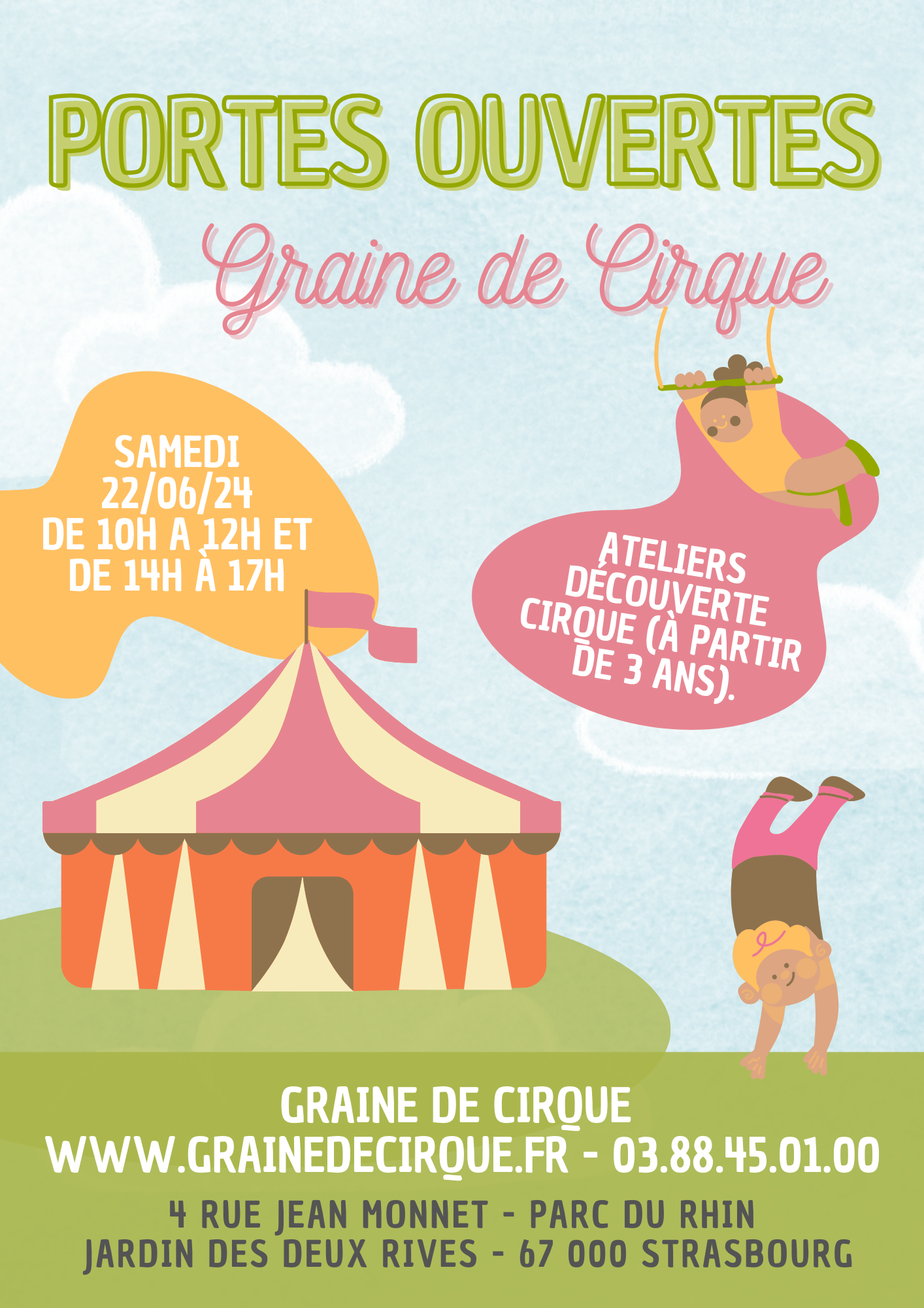 Le samedi 22 juin 2024 (de 10h à 12h et de 14h à 17h), Graine de Cirque vous ouvre les portes de ses chapiteaux !