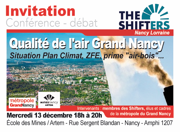 Une conférence animée par des intervenants de la Métropole du Grand Nancy sur cet enjeu majeur de santé publique. Au programme : les polluants atmosphériques et leurs origines, les mesures du "Plan Air", les Primes "Air bois" et les ZFE - Zones à Faibles émissions. Conférence organisée par les Shifters de Nancy, une association en appui du Shift Project le Think Tank bas carbone.