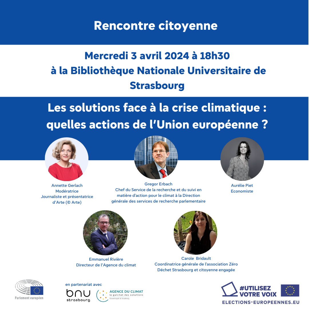 Cet événement aura lieu à la BNU de Strasbourg le mercredi 3 avril prochain à 18h30 sur le sujet « Les solutions face à la crise climatique : quelles actions de l’Union européenne ? »