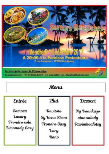 L’association Les Disciples vous convient à un repas malgache le vendredi 1 décembre à 20h.