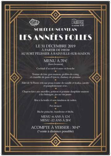 Pour clôturer cette année 2019, le Fort Pélissier de Bainville-sur-Madon vous accueille à l’occasion de la St Sylvestre au restaurant panoramique de l’Auberge du Fort Pélissier pour une soirée sur le thème des Années Folles avec décoration et animation musicale.